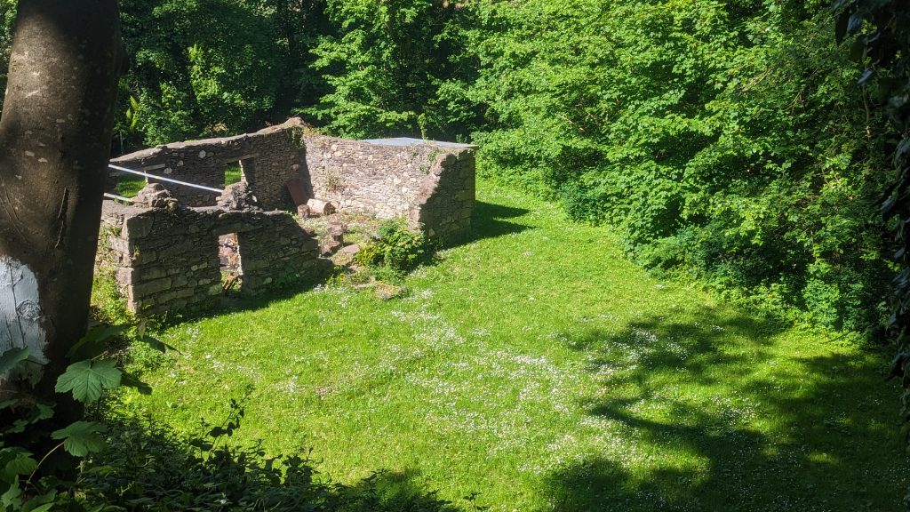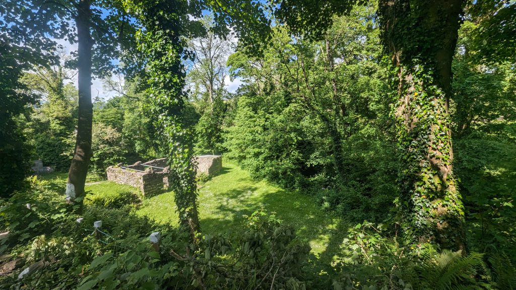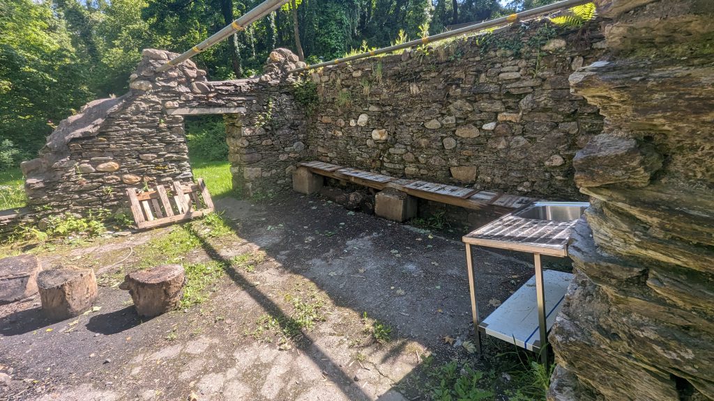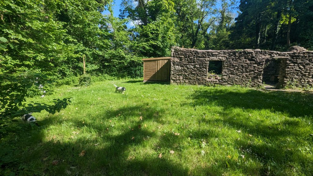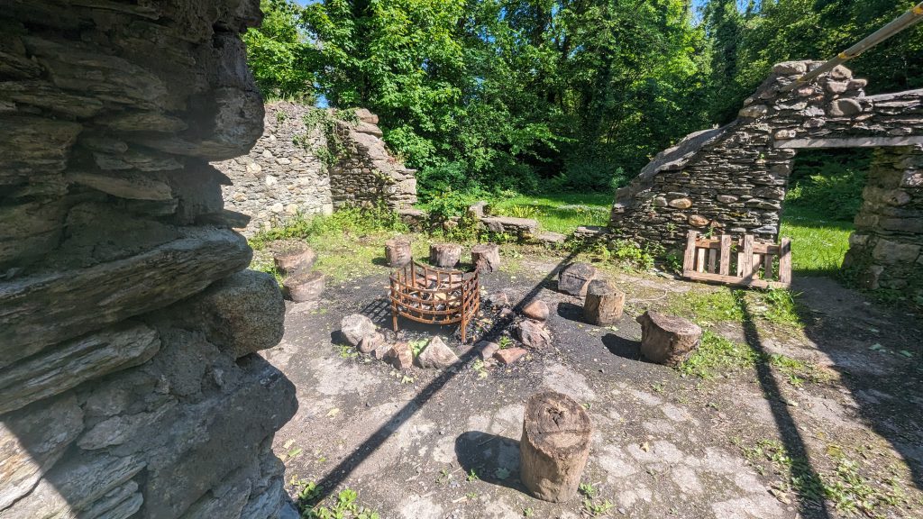 On the lower site is a ruined mill where you can have a campfire in the fire basket this is surrounded by 3 flat areas that suit camping, the fist to the left of the ruin can take 4 – 6 tents and doubles as an archery range, can get approx. 6 – 8 tents on the larger area to the right of ruin and above the ruin is a smaller area will suit 1 – 2 tents all depending on size.