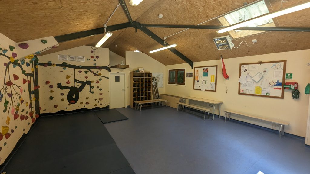 On the upper level we have our toilet block with male and female toilets and showers along with a store and sinks areas for catering, there are however no fixed cooking facilities. Beyond this we have another grass area that suits camping and will take 4 tents depending on size, This area can also used as an archery range and we have a hall, this has an upper balcony area that can sleep 4 – 6 adults and lower hall which is approximately 6 x 7m this also has an indoor traversing wall. Indoor can be used for sleeping if required.
